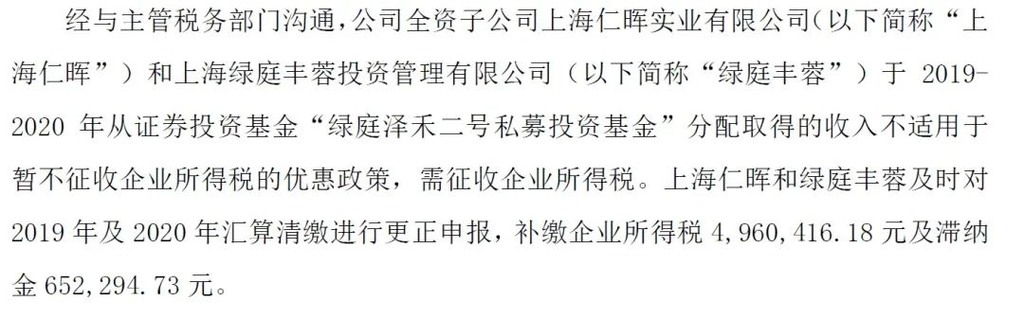 从上海绿庭投资公布的信息来看,上海税务局的态度和湖北、深圳税务局态度一样,私募证券投资基金分红需要缴纳企业所得税。但是,从披露内容来看,上海绿庭投资针对这笔业务补税只是加收了滞纳金,并没有定性为偷税处罚。